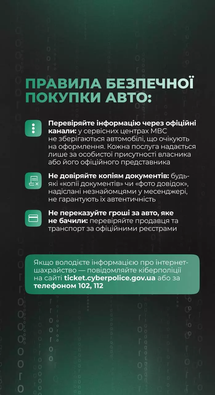 Увага, шахраї! Кіберполіція та Головний сервісний центр МВС попереджають про небезпечну купівлю авто онлайн