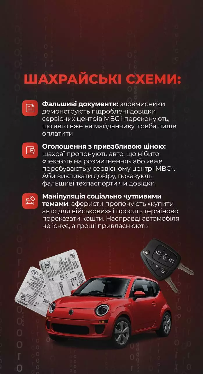Кіберполіція та Головний сервісний центр МВС попереджають про нову хвилю шахрайства при купівлі автомобілів онлайн. Шахраї пропонують неіснуючі авто за “вигідною ціною”, підробляють документи та апелюють до емоційних тем, зокрема волонтерства, щоб виманити гроші у покупців.