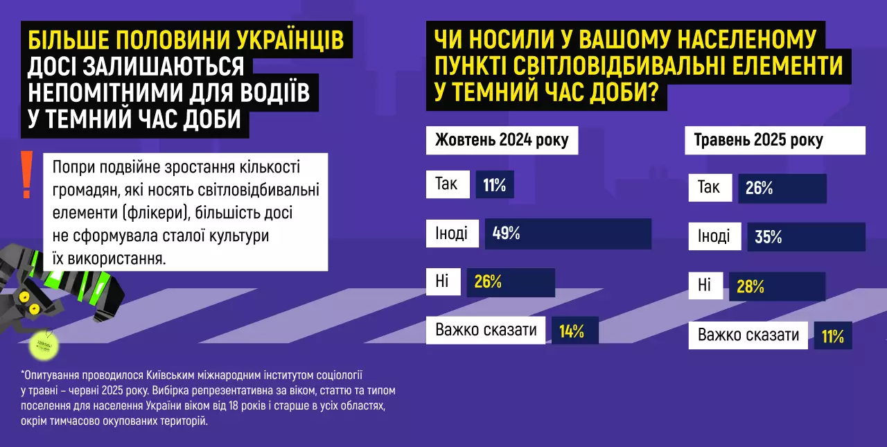 За даними Всеукраїнського опитування «Думки і погляди населення України» (Омнібус), проведеного Київським міжнародним інститутом соціології у травні 2025 року, третина українців досі залишаються малопомітними на дорозі в темну пору доби взимку. Так, минулої зими лише 26% українців регулярно користувалися світловідбивальними елементами. У жовтні 2024 р., за результатами аналогічного опитування соціологічної групи «Рейтинг», регулярне використання становило лише 11% — показник помітно зріс зокрема і на тлі спільних інформаційних зусиль державних і міжнародних партнерів.