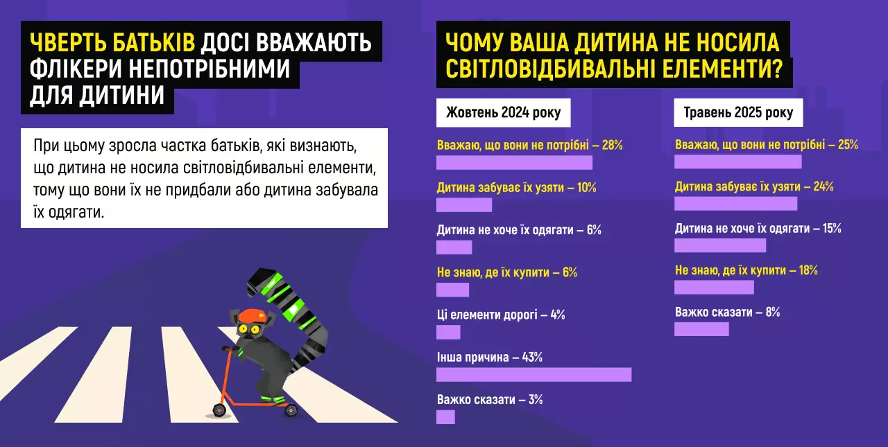 Серед дітей ситуація краща, але далека від безпечної: за оцінками батьків, лише 40% школярів носили флікери минулої зими.